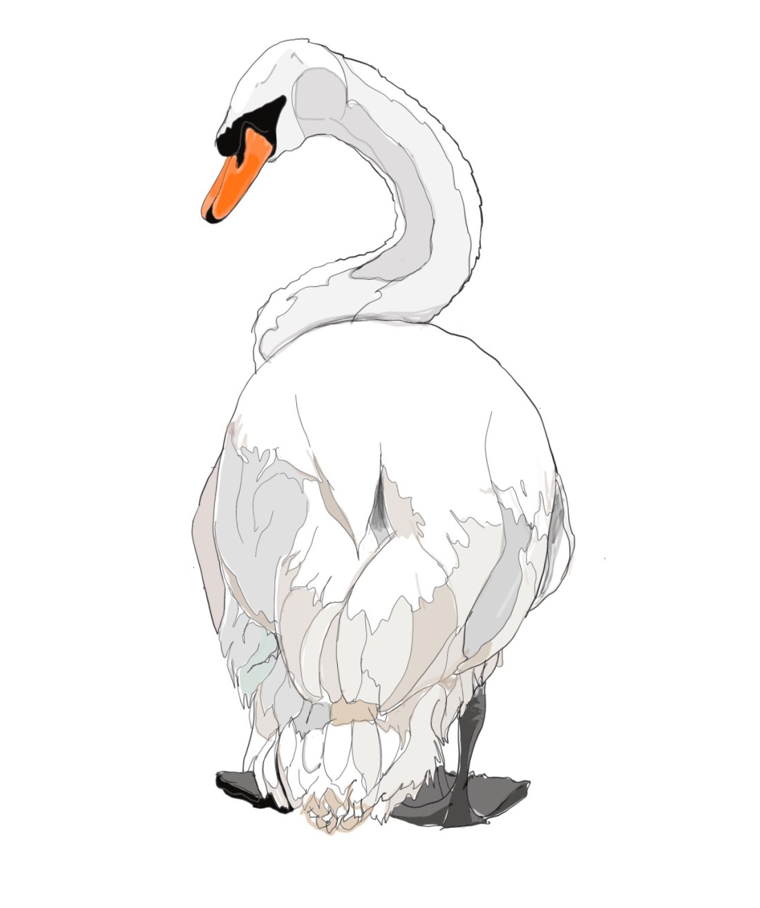 One of my specific areas of interest this summer is the bird population of the park. I still don’t necessarily know which is a duck or which is a goose though. Reading signs is obviously not one of my current interests. However, I do know a swan when I see one. While drawing one I noticed that a swans backend is disproportionately big, and yet, it is perfect.