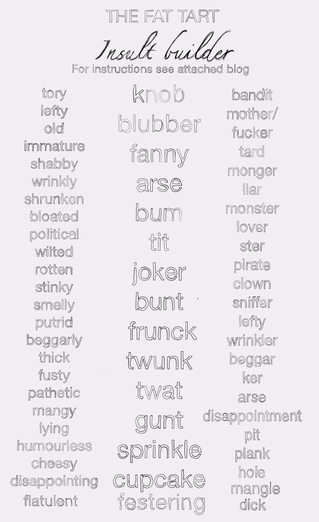 In a spirit of helpfulness I’m attaching, in sketch form, the Fat Tart insult builder. It’s a super flexible method of finding an insult when rendered speechless by outrageous behaviours.